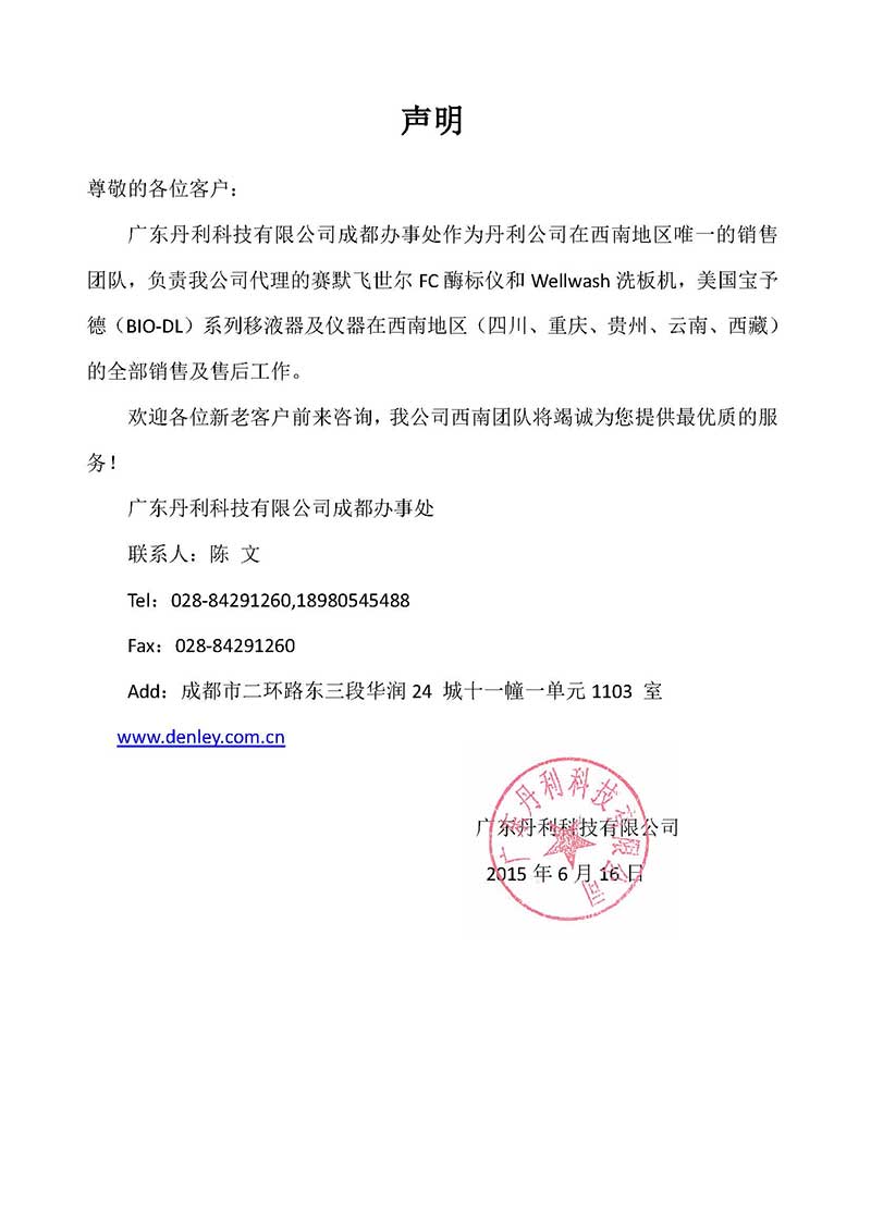 尊敬的各位客戶: 廣東丹利科技有限公司成都辦事處作為丹利公司在西南地區(qū)唯一的銷售團(tuán)隊(duì),負(fù)責(zé)我公司代理的賽默飛世爾FC酶標(biāo)儀和Wellwash洗板機(jī),美國寶予德(BIO-DL)系列移液器及儀器在西南地區(qū)(四川、重慶、貴州、云南、西藏)的全部銷售及售后工作。